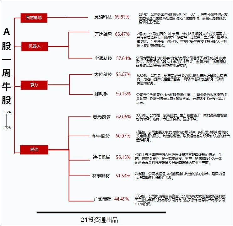 多只北交所个股跻身牛股榜,固态电池概念股灵鸽科技股价创新高本期牛股榜中(剔除近1月上市的次新股,下同)中,有5只属于北交所个股,其中灵鸽科技(833284.BJ)以69.83%的周涨幅夺魁,万达轴承(920002.BJ)和春光药装(838810.BJ)均为北交所个股,周涨幅分别为65.47%和62.06%, 华丰股份(605100.SH)周涨近61%。值得一提的是,本期十大牛股的涨幅均在50%以上。