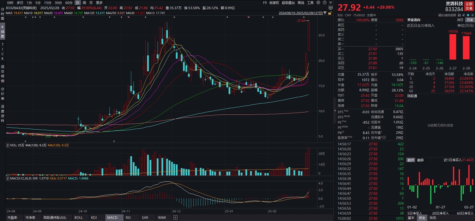 二级市场上,灵鸽科技2月27日、28日连续两个交易日收获30CM涨停板,过去一周(2月24日-28日)累计涨幅达69.83%。截至2月28日收盘,公司股价报27.92元创历史新高。