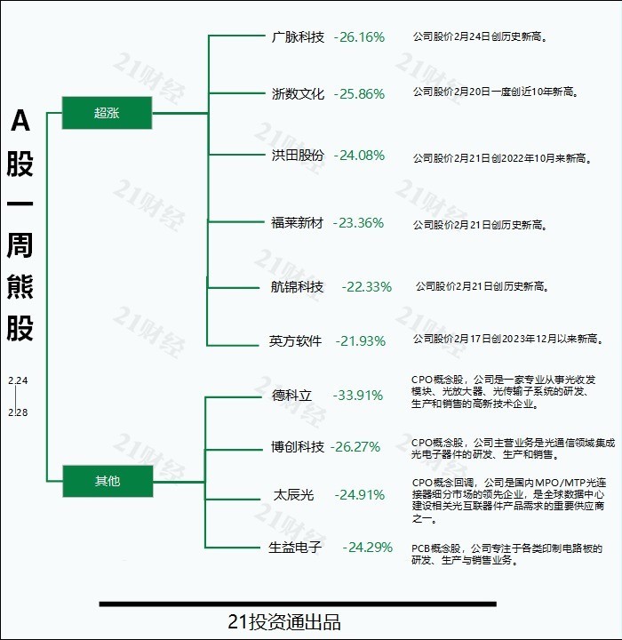 本期跌幅最多的前10只个股中,有3只属于CPO概念股,其中最熊股德科立(688205.SH)走出“五连阴”周跌33.91%,博创科技(300548.SZ)跌幅达26.27%,广脉科技(838924.BJ)的跌幅均在26%以上、浙数文化(600633.SH)和太辰光(300570.SZ)分别跌25.86%和24.91%。