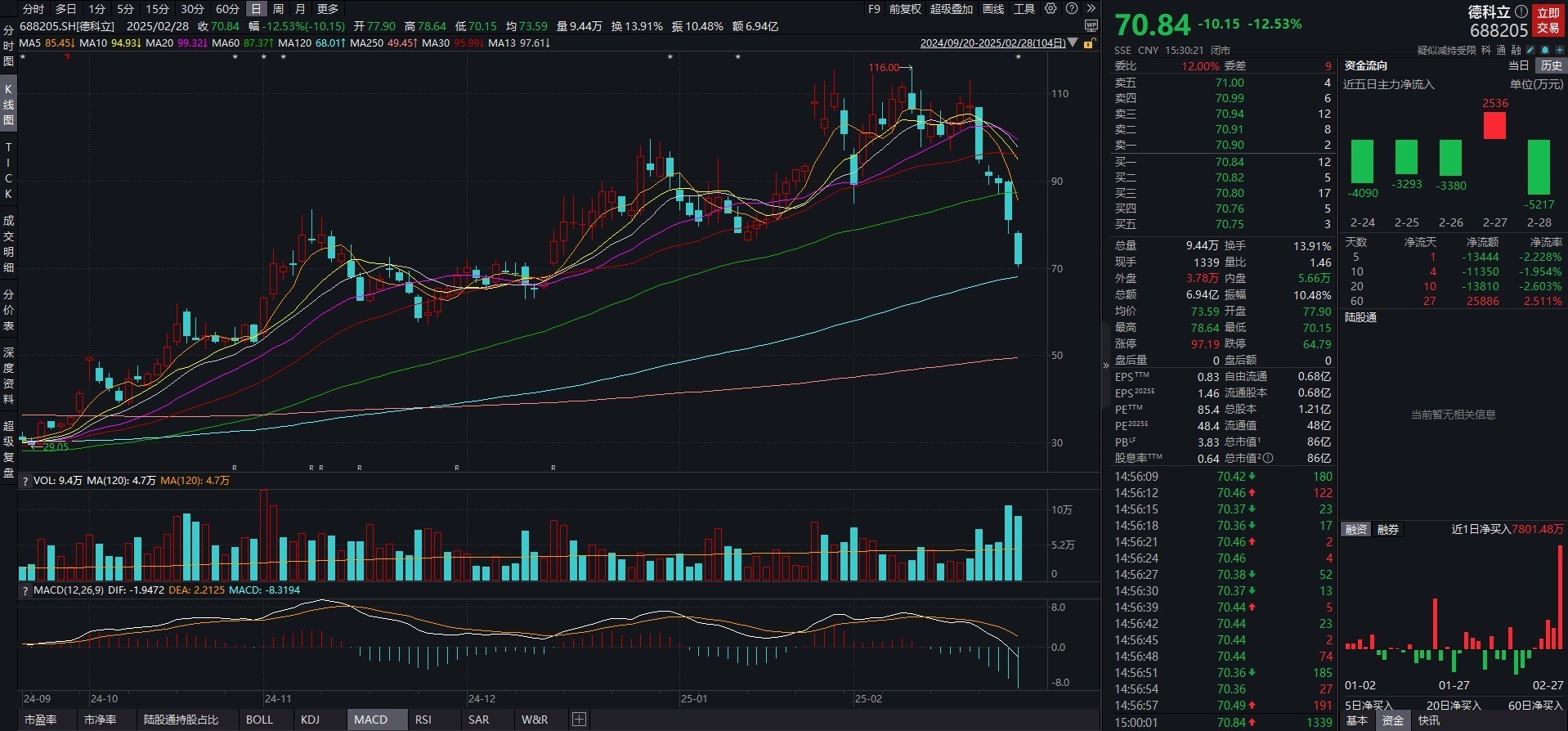 行情上,过去一周,CPO概念股震荡下挫,2月24日周一德科立跌超11%,此后四个交易日单边下跌,2月28日再度跌超12%,周跌幅近34%。资金流向上,Wind数据显示,过去一周,主力净流出该股超1.3亿元。